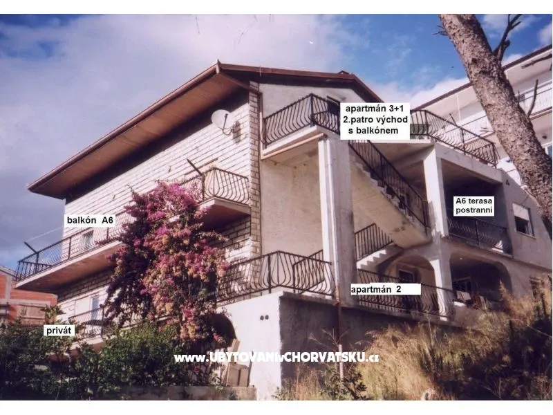 Die Villa verfügt über insgesamt 6 Wohnungen: 3x 2 Betten, 2x 2+2 Betten, 1x 6 Betten. Das Appartement mit 6 Betten ist ein Luxus-Appartement auf der gesamten ersten Etage. Bestehend aus: 3 Schlafzimmer 2 +2 +2, Küchen, 2 Badezimmer / WC. Von jedem Schlafzimmer gibt es Türen zum Balkon mit herrlichem Meerblick, seitlichen Terrasse. Vier Wohnungen im zweiten Stock in den Dachboden