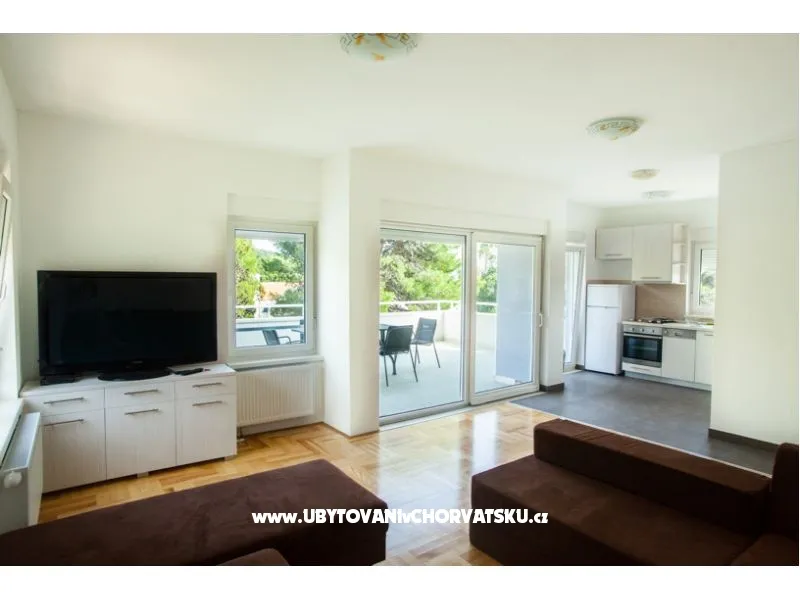 RO-Wohnung, Fläche von 55 m2, - Wohnzimmer 40 m2, Doppelbett 180x200 cm, Küche, Bad, TV, Esstisch, - Schlafzimmer 15 m2, Doppelbett 160x200 cm, TV - Gartenterrasse 30 m2