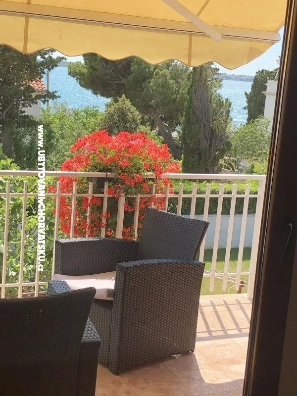 Wohnung im ersten Stock eines Familienhauses, 20 m vom Strand entfernt, klimatisiert. Modern eingerichtet, mit voll ausgestatteter Küche mit Geschirrspüler und Backofen, Wohnzimmer, Terrasse mit Meerblick. Gratis Wifi. 2 Schlafzimmer, Badezimmer mit Waschmaschine, separates WC. Großer Garten mit Parkplatz, Grill.